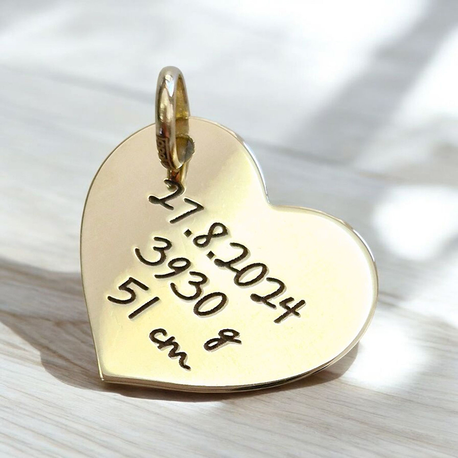 Jemný zlatý prívesok v tvare srdiečka s možnosťou personalizácie – na prednej strane vygravírujeme meno vášho dieťatka, na zadnej strane údaje o jeho narodení– spomienka na celý život. Dokonalý darček k narodeniu bábätka, krstu alebo ako nezabudnuteľný darček pre mamu či starých rodičov.