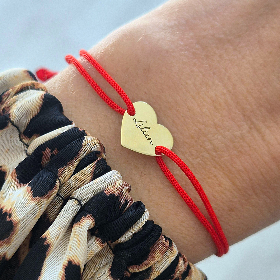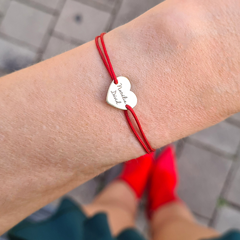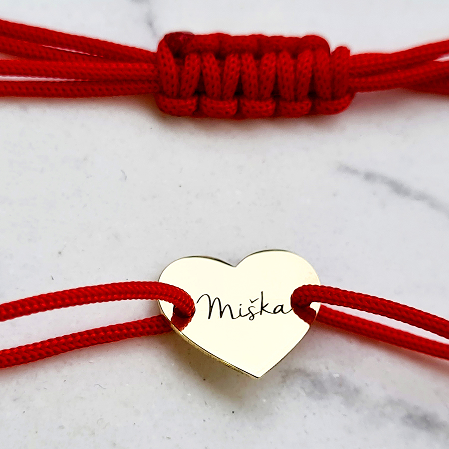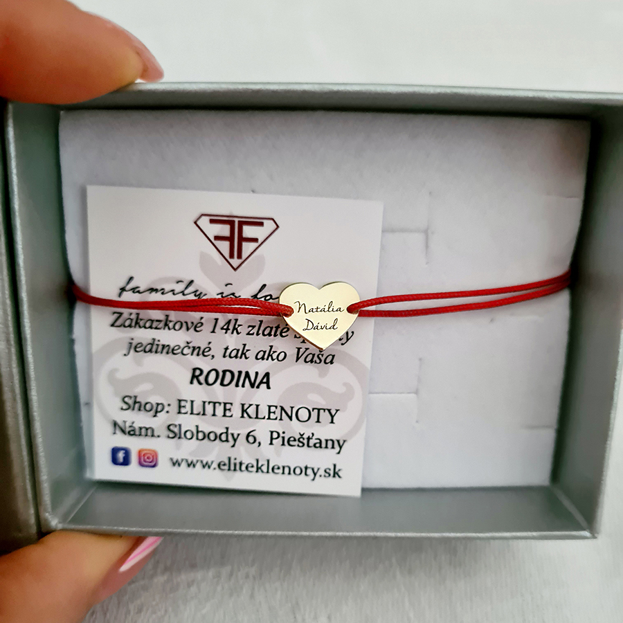 Zlatý náramok na červenej šnúrke so srdiečkomHľadáte darček, ktorý je jemný, elegantný a nadčasový? Tento zlatý náramok na červenej šnúrke so srdiečkom je ideálnou voľbou pre každú ženu aj mladé dievča. Spojenie červenej šnúrky a 14k zlatého srdiečka symbolizuje lásku, priateľstvo a ochranu. Vďaka možnosti gravírovania mena alebo viacerých mien sa z neho stane výnimočný náramok – osobný doplnok, ktorý má dušu.Darujte blízkej osobe zlaté srdce na šnúrke ako symbol lásky, rodiny alebo priateľstva. Perfektný darček pre ženu, priateľku, mamu či dcéru – originálny šperk, ktorý sa stane obľúbeným každodenným talizmanom.