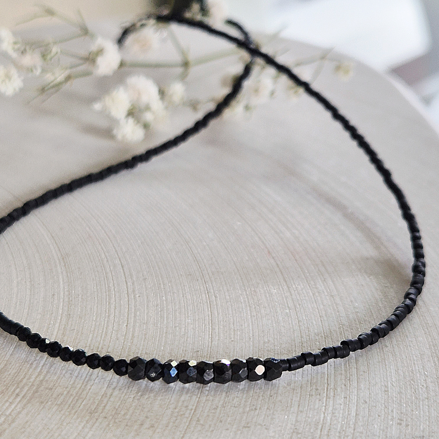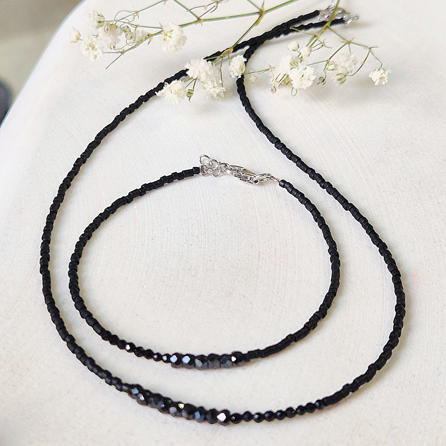 Tento jemný strieborný náhrdelník je ručne vyrobený z čiernych sklených MIYUKY korálok, lesklého HEMATITU a SPINELU, čo mu dodáva elegantný a nadčasový vzhľad. Hematit je známy ako ochranný kameň, ktorý podporuje stabilitu a uzemnenie, zatiaľ čo spinel prináša energiu, regeneráciu a vnútornú silu. Vďaka svojmu minimalistickému dizajnu je náhrdelník ľahko kombinovateľný a vhodný na každodenné nosenie aj ako šperk s hlbokým významom.Materiál : striebro 925 ródiovanéPolodrahokam: HEMATIT, SPINELVáha : 2,72 gDĺžka : 39 – 40 cmK uvedenému šperku je vhodné skombinovať do súpravy náramok (Viď súvisiaci tovar).