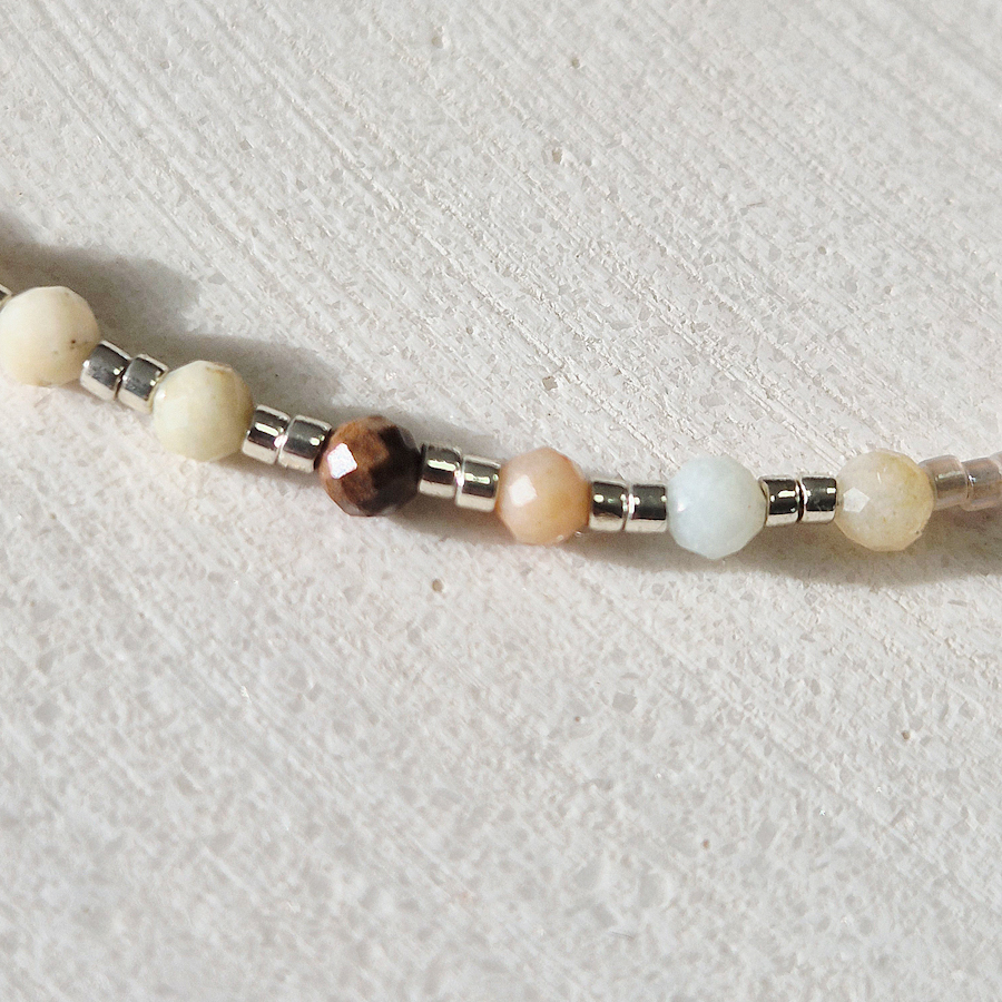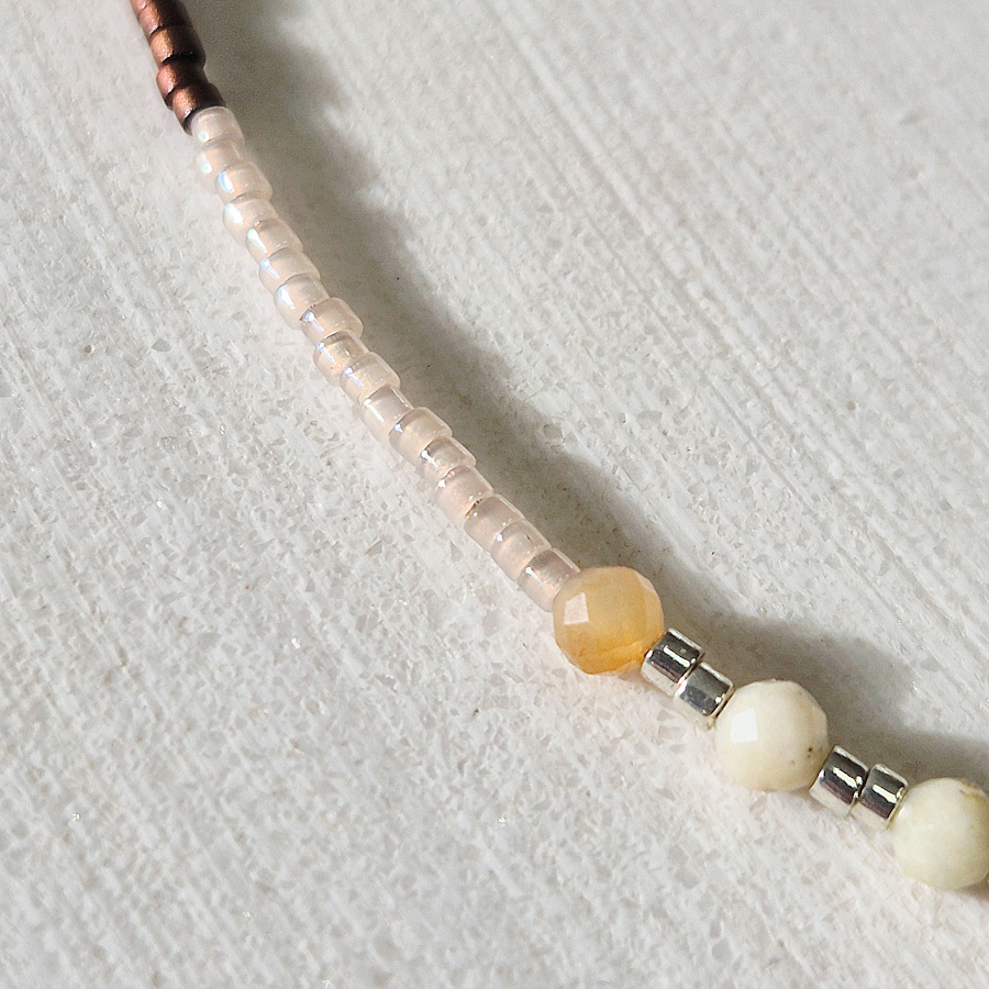 Tento jemný strieborný náramok je vytvorený z hnedých sklených korálok MIYUKI a prírodného žltého AMAZONITU, kameňa harmónie, pokoja a vnútornej rovnováhy. Amazonit v teplých odtieňoch prináša do šperku symboliku pozitívnej energie a podpory pri zvl... Zobraziť celý obsah