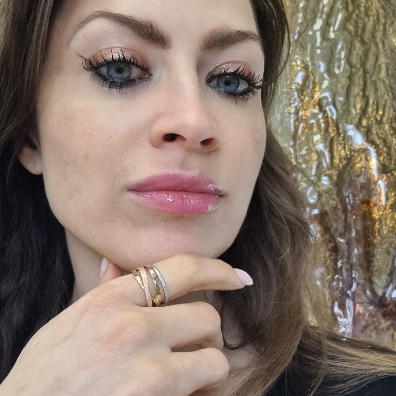 Výnimočný prsteň, ktorý bude zdobiť Vašu ruku. Jeho výhodou a výnimočnosťou je, že sa hodí k akému koľvek náhrdelníku, či náušniciam. Skladá sa z 3 obrúčok. Stredná je žltá lesklá, ostatné dve sú jemne matovanné, ale hladké, v ružovom a bielom zlate. Sú elegantne vzdialenné od seba a robia dojem 3 vyskladaných prsteňov, čo je momentálne módny trend. Materriál : 14 karátové zlato žlté, biele, ružové Váha :3.52 g Veľkosť :55 K uvedenému šperku je vhodné skombinovať do súpravy náušnice. Viď SÚVISIACI TOVAR
