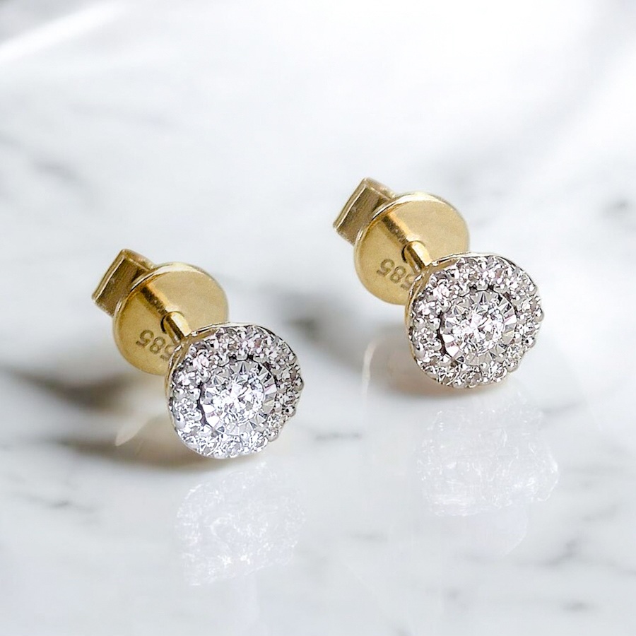 Elegantné a jemné zlaté napichovacie náušnice sú zdobené kruhovými prvkami, ktoré sú osadené ligotavými briliantami. Vytvárajú efekt celoplošného trblietavého šperku, vďaka nádhernému brusu diamantu. Sú vhodné na formálne príležitosti, alebo ako decentný doplnok na každý deň. Materiál : 14 karátové zlato Váha šperku 1,40 g Váha brialiantov : 0,161 ct Farba a čistota : GH, SI Diameter centrálnej časti : Ø 0,6 cm K uvedenému šperku je vhodné skombinovať do súpravy náhrdelník i prsteň. Viď SÚVISIACI TOVAR