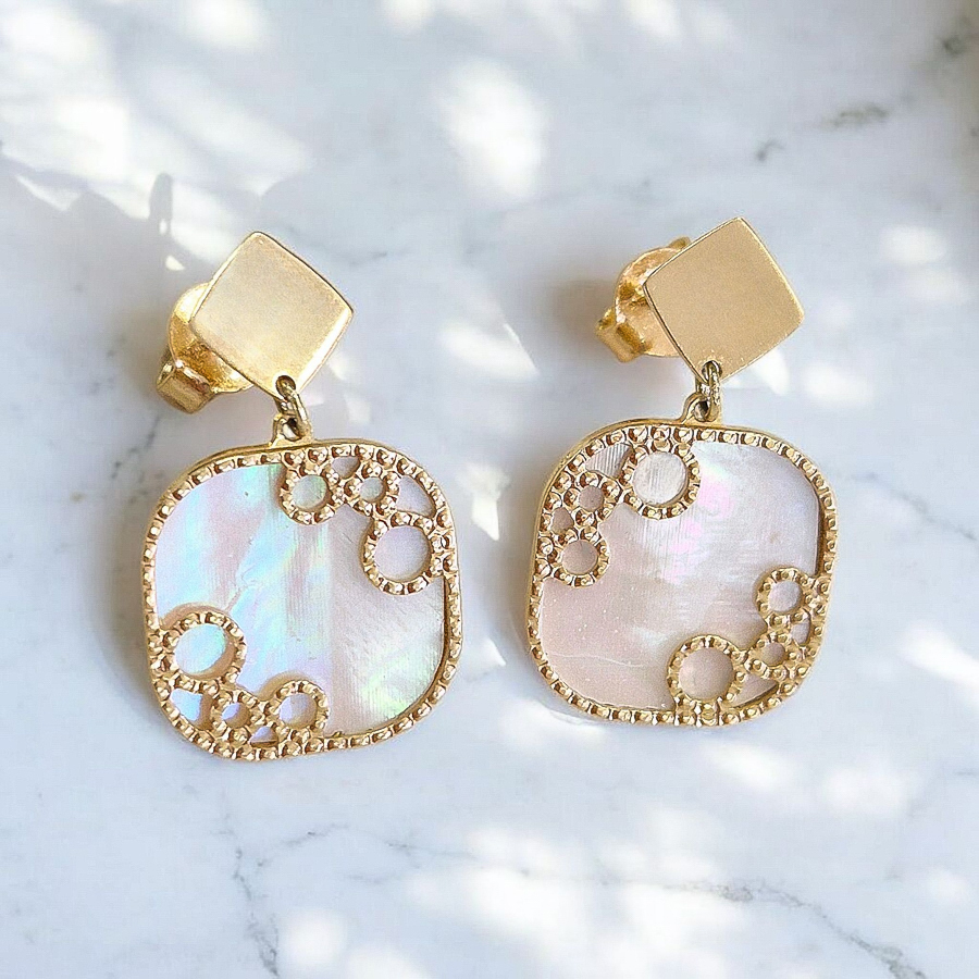Zujímavé a netradičné náušnice pre milovníčky perlete, jemnosti a exkluzivity. Sú v tvare oblej kocky, ploché a zdobené v dvoch rohoch jemným ornamentom zo zlata. Celá plocha je vyplnená krásnou bielo dúhovou perleťou. Zapínanie poteší i dámy, ktoré hľadajú prekrytie väčšej ušnej dierky, nakoľko kolík je súčaťou plochej zlatej kocky, ktorá zabezbečí dané prekrytie. Materiál : 14 karátové zlato Váha : 3,25 g Dĺžka : 2,4 cm K uvedenému šperku je vhodné skombinovať do súpravy náhrdelník. Viď SÚVISIACI TOVAR