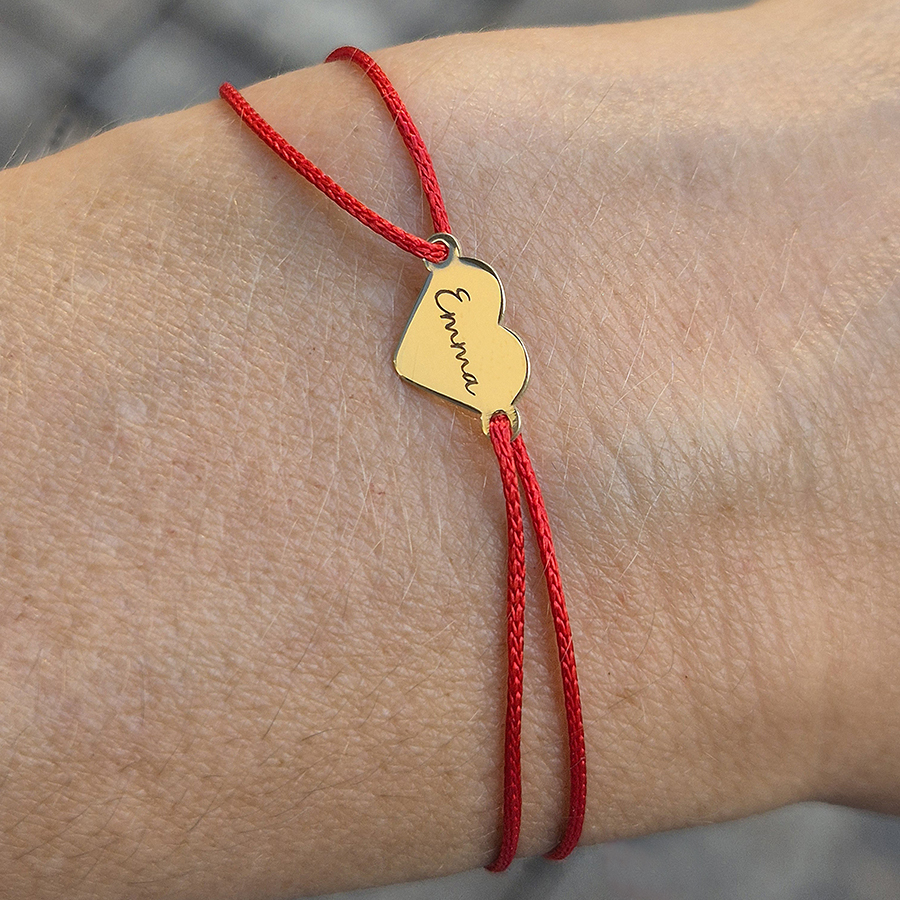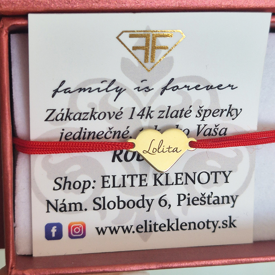 Zlatý náramok so srdiečkom na červenej šnúrke – personalizovaný šperkAk hľadáte darček, ktorý je jemný a nadčasový, tento zlatý náramok so srdiečkom na červenej šnúrke je ideálnou voľbou. Moderný náramok z 14k zlata patrí k najobľúbenejším šperkom a predstavuje krásne vyznanie lásky alebo priateľstva. Pre osobný dotyk si môžete na srdiečko nechať vygravírovať meno alebo iniciálu dieťaťa, partnera či blízkej osoby.Tento personalizovaný náramok je ideálny na každodenné nosenie a osloví svojou symbolikou, eleganciou a jemnou nadčasovosťou.