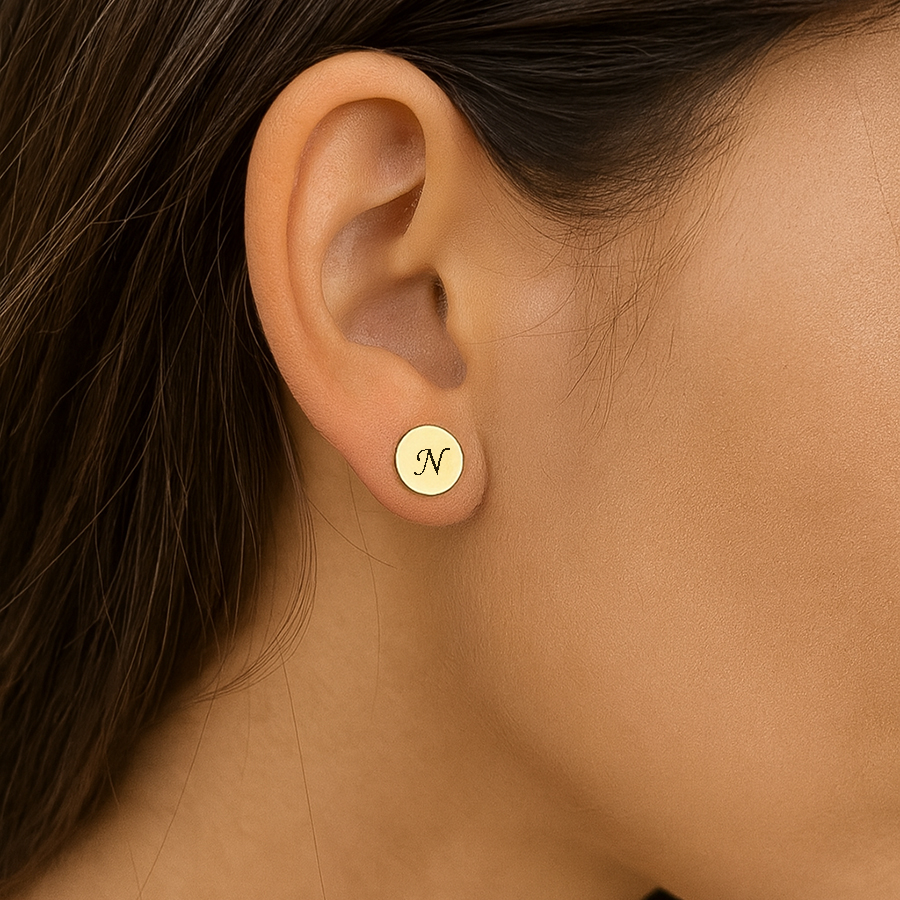 Zlaté ŠROBOVACIE náušnice KRUH s gravírovanou INICIÁLOU -14k zlato