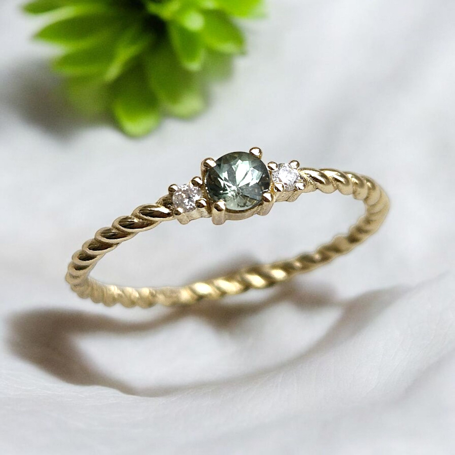 Do skupiny prstienkov s drahými kameňmi je zaradený i tento sofistikovaný jemný briliantový prsteň, zdobený s nezvyčajným zeleným zafírom výnimočnej farby. Drahokam je osadený centrálne a je podporovaný z oboch strán v línii obrúčky dvoma briliantami. Každý drahý kameň je uchytený v 4 krapniach, čo ich predurčuje do tvaru štvorca. Obrúčka prstienka je zhotovená z točeného jemného zlata. Takže pekne korešponduje a zjemňuje celkový dizajn prsteňa. Materiál : 14 karátové zlato Váha prsteňa : 1,05 g Váha : zafíru : 0,2 ct Váha briliantov : 0,04 ct Veľkosť : 55
