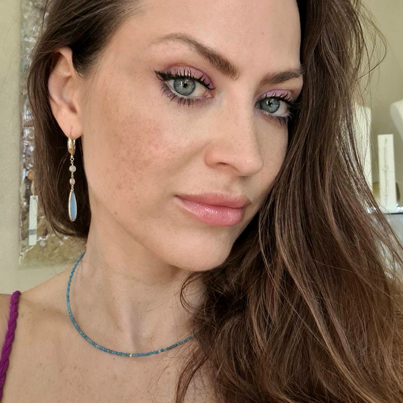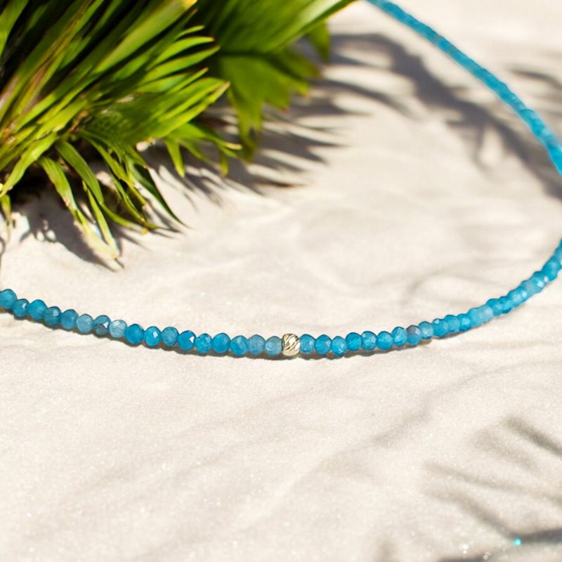 Modrý Apatit je nádherný polodrahokam, ktorý je obľúbený pre svoju intenzívnu farbu tropických oceánov. Má jemný brus a tým aj jemný lesk. Hrá odtienkami tyrkisovej farby. V porovnaní s tyrkisom, ktorý je nepriehľadný a matnejší, Apatit  je mliečnej konzistencie. V spojení s mini zlatou guličkou a uzáverom zo 14 kar. zlata vytvára dokonalú jemnú ozdobu Vášho dekoltu. Materiál : 14 karátové zlato Váha : 3,52 g Dĺžka : 41 cm K uvedenému šperku je vhodné skombinovať do súpravy náušnice i náramok. Viď SÚVISIACI TOVAR