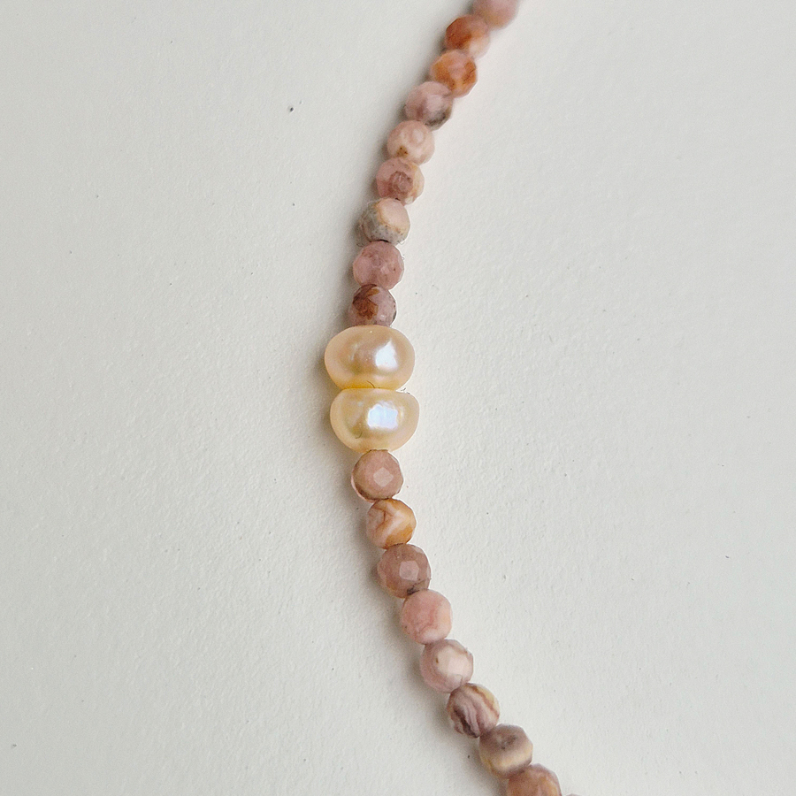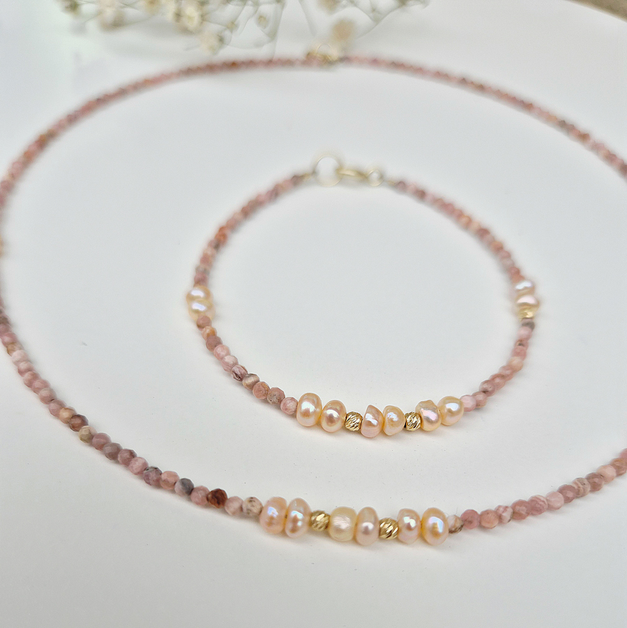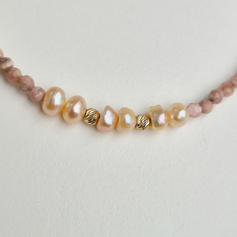 Zlatý náhrdelník RODOCHROZIT a riečne lososové PERLY