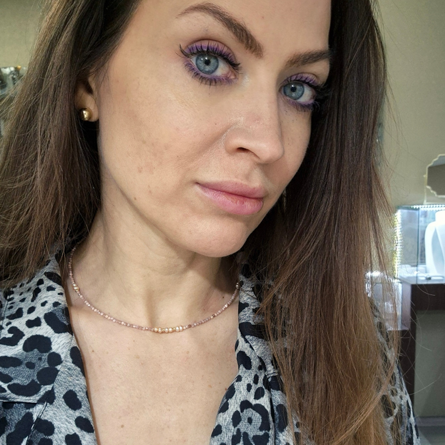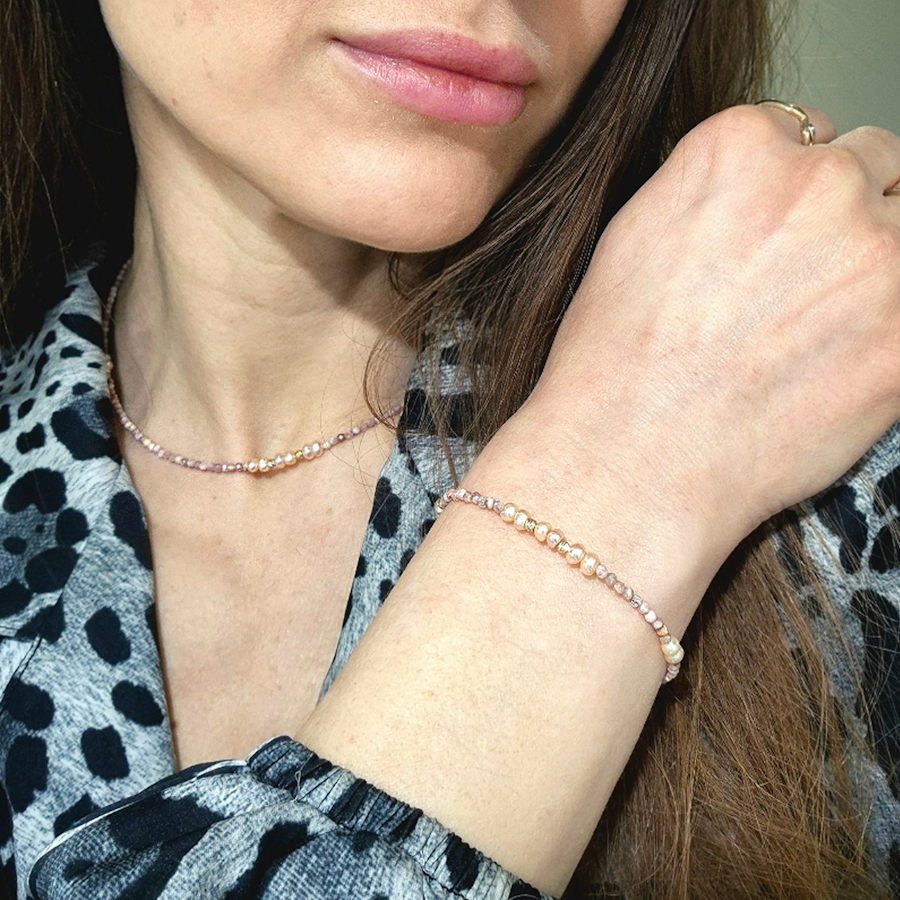 Zlatý elegantný náhrdelník je navrhnutý v jemnom, ženském dizajne a kombinuje prírodný rodochrozit s lososovými riečnymi perlami. Rodochrozit je polodrahokam lásky a súcitu, ktorý podporuje emocionálne hojenie, sebalásku a srdcovú rovnováhu, zatiaľ čo perly symbolizujú čistotu, nežnosť a vnútorný pokoj. Vďaka svojmu harmonickému vzhľadu je náhhrdelník ideálny na každodenné nosenie aj špeciálne príležitosti ako zmysluplný šperk s hlbokým významom.Materiál : 14 karátové zlatoPolodrahokam : RODOCHROZIT, riečne lososové PERLYVáha : 4,24 gDĺžka : 40 cmK uvedenému šperku je vhodné skombinovať do súpravy náramok. (Viď súvisiaci tovar).