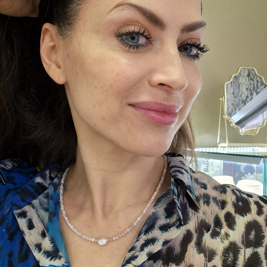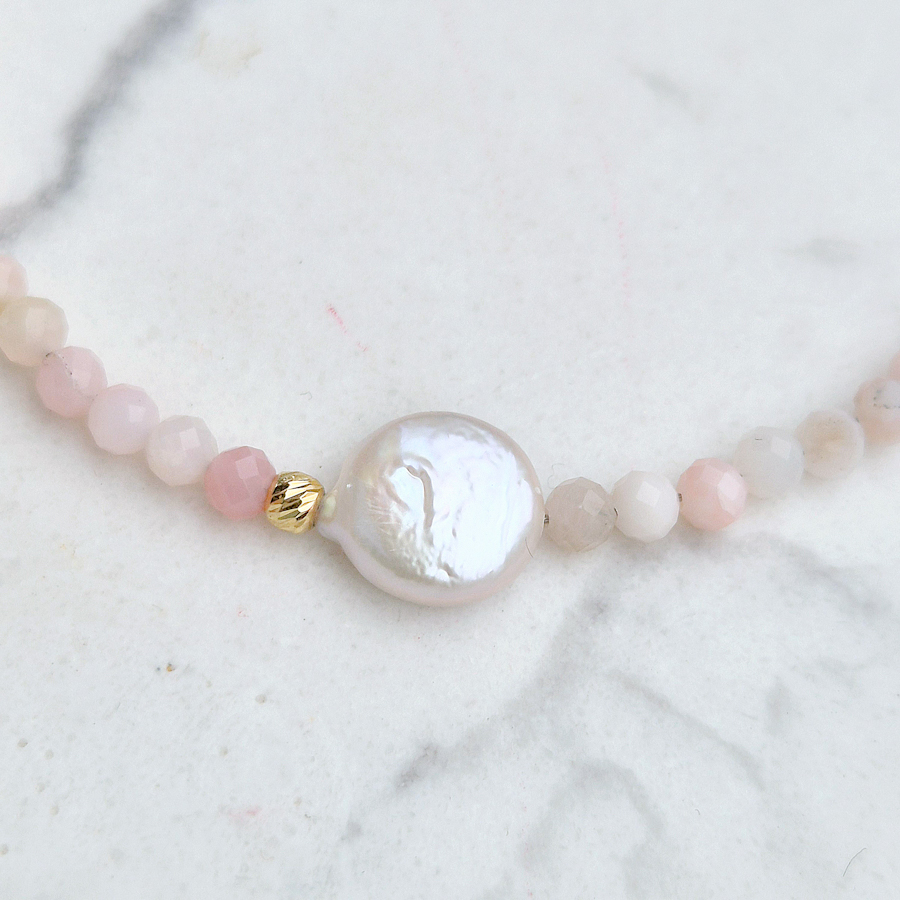 Zlatý náhrdelník z ružového opálu a perly je nežný šperk zdobený prírodnými drahokamami, ktorý poteší svojou jemnosťou a eleganciou. Je to krásny darček, ak chceš pripraviť niekomu milé prekvapenie plné symboliky a jemného luxusu. Tento nadčasový kúsok je ideálny na bežné nosenie i  na výročie, keď chceš darovať niečo výnimočné a s hlbším významom.Materiál : 14 karátové zlatoVáha :6,57 g Dĺžka : 48 cmK uvedenému šperku je vhodné skombinovať do súpravy náramok. Viď SÚVISIACI TOVAR