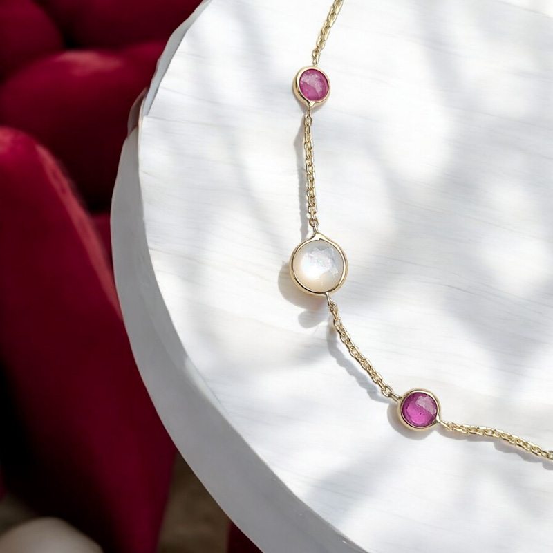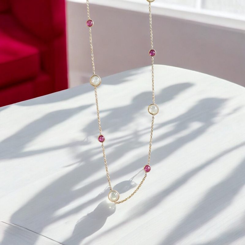 Náhrdelník v našej ponuke je jemný nádherný šperk, ktorého dominantou sú dva drahokamy : Rubín a  Mesačný kameň. Rubín je jedným z najviac cenených drahokamov pre svoju jedinečnú farbu, ale i pre svoju mimoriadnu tvrdosť (9), ktorá zabezpečí jeho dokonalý brus a tým i lesk. Mesačný kameň je jemno mliečny fluoreskujúci drahokam. Už jeho názov ho definuje. Bol nájdený v meteoritoch ale i na Mesiaci. Drahé kamene v náhrdelníku sú spojené zlatou retiazkou, ktorá podčiarkuje jeho eleganciu a výnimočnosť. Materiál : 14 karátové zlato Váha : 3,78 g Dĺžka : 45 a 48 cm K uvedenému šperku je vhodné skombinovať do súpravy náušnice i náramok. Viď SÚVISIACI TOVAR