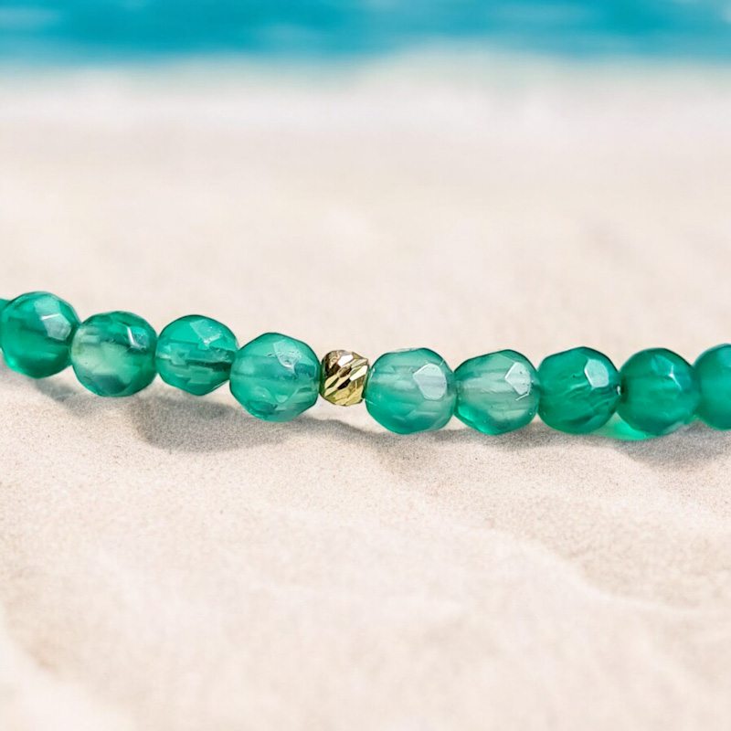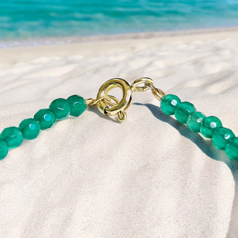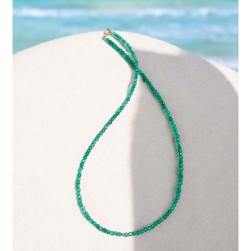 Skvelá ozdoba Vášho dekoltu počas leta. Tento náhrdelník je zo zeleného onyxu, krásnej smaragdovej farby. Šnúra drahokamu je doplnená o mini guličky zo zlata i ukončenie karabinkou i očkom je v zlate. Materiál : 14 karátové zlato Váha náhrdelníka :3.... Zobraziť celý obsah