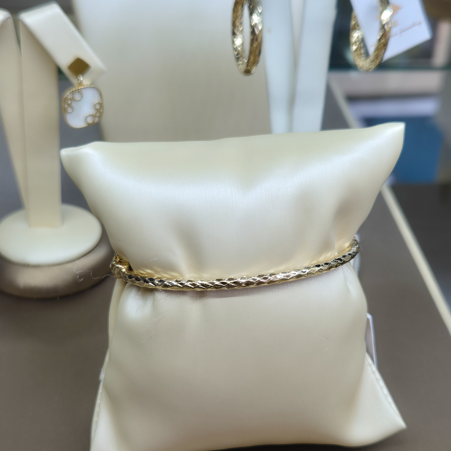 Klasický kruhový bangle (pevný) náramok – tvar, ktorý neomrzí. Tento náramok má pridanú hodnotu, má nezvyčajné gravírovanie, tzv. fazetovanie, akoby výbrus diamantu v tvare mini kosoštvorcov. To zabezpečí, že plôšky sa nádherne lesknú, láme sa na nich svetlo s jemnou textúrou. Pripomína to pletenú, resp. reliefnu sieťku. Zapínanie je istené slučkovou poistkou.Materiál : 14 karátové zlatoVáha : 3,97 gVeľkosť : Ø 6,7cm x 5,7 cmK uvedenému šperku je vhodné skombinovať do súpravy náušnice i prsteň . Viď SÚVISIACI TOVAR