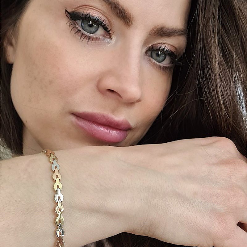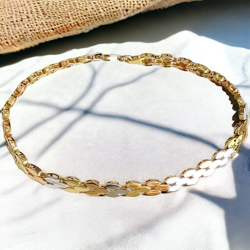 Pravidelne sa opakujúce tri lupienky v troch farbách zlata, to je charakteristika tohoto jedinečného náramku, ktorý krásne kopíruje Vaše zápästie. Je dostatočne hrubý, aby vynikol, a aby zaujal Vaše okolie svojim leskom. Materiál : 14 karátové zlato žlté, biele i ružové Váha : 6.58 g Dĺžka : 19 cm