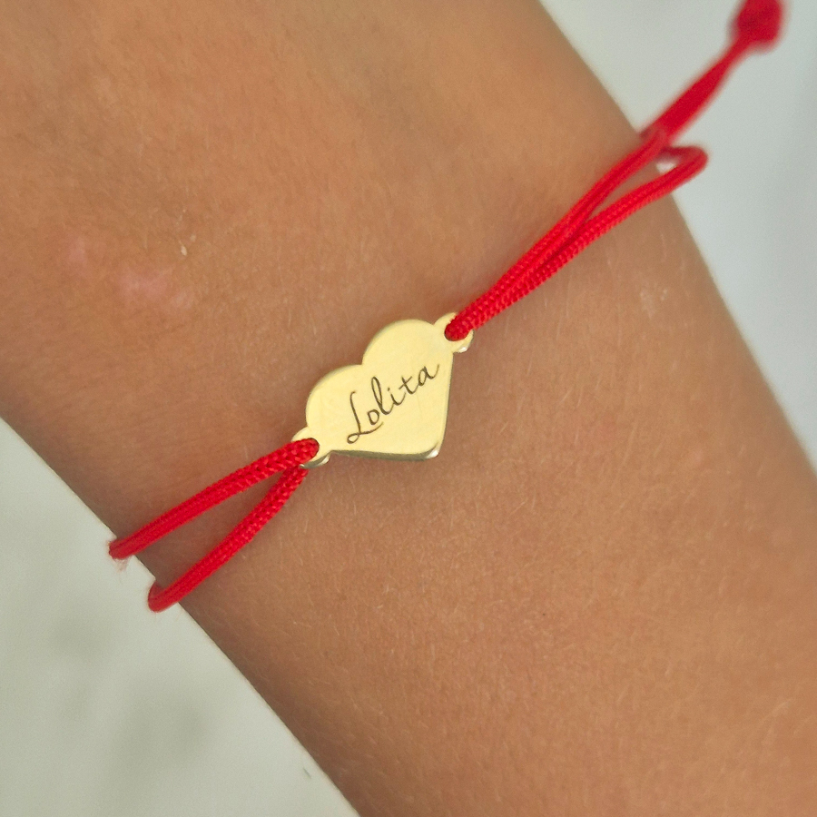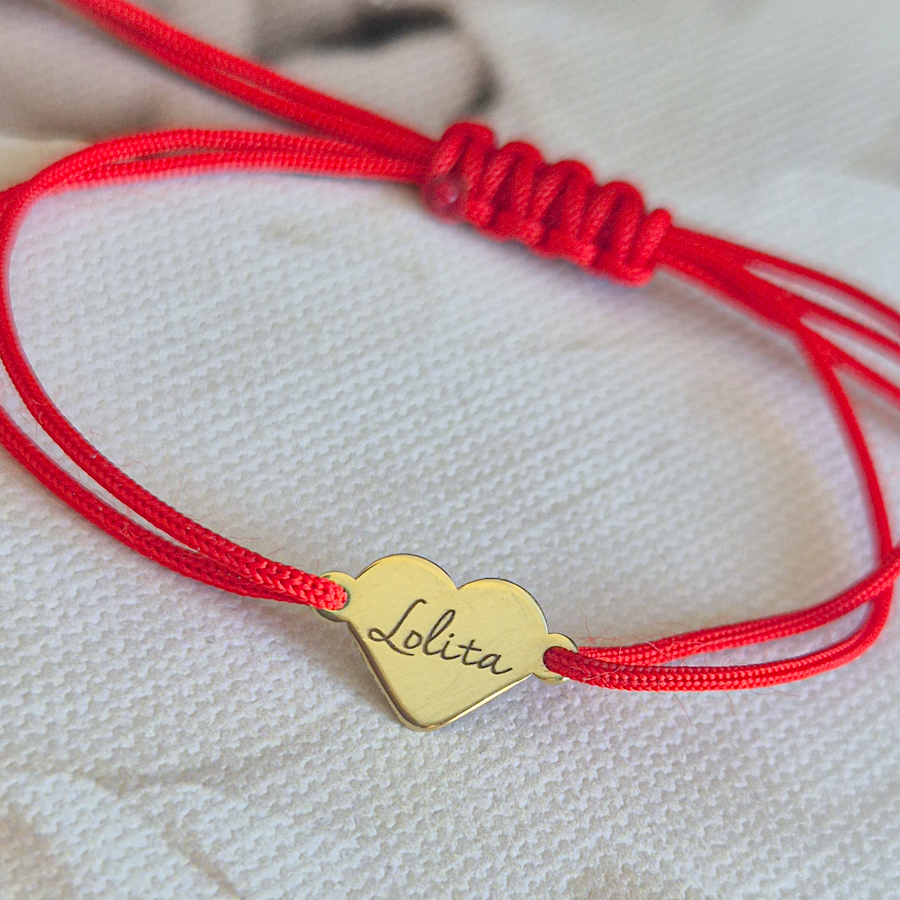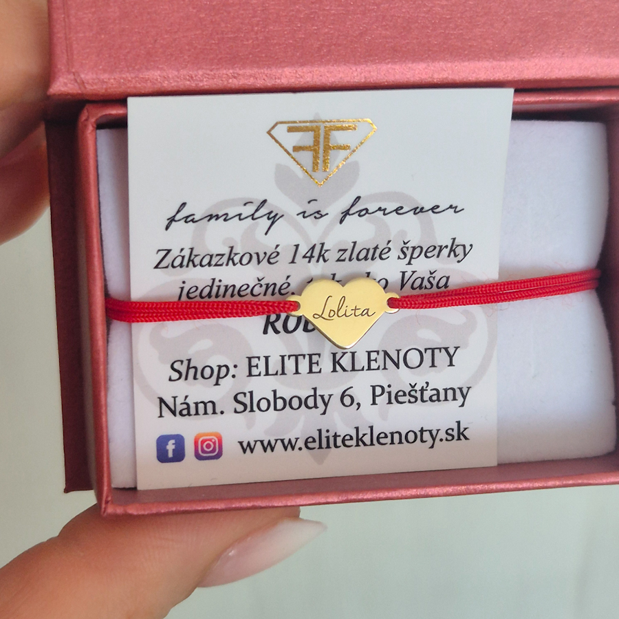 Zlatý náramok oblé SRDIEČKO s MENOM alebo INICIALOU na červenej šnúrke