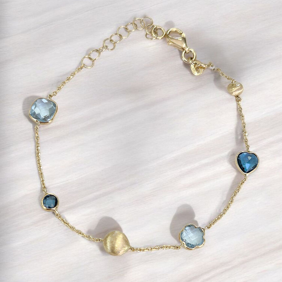Tento retiazkový náramok je dozdobený jemnými Aquamarínmi a tmavomodrými Topasmi. Kamene sú brúsené do rôznych tvarov, ako srdce, kvet či štvorec. To dodáva šperku hravý až sofistikovaný vzhľad. Náramok pôsobí ľahko a vzdušne ideálny na každodenné nosenie. Materiál : 14 karátové zlato Váha : 2,62 g Dĺžka : 17 – 20 cm K uvedenému šperku je vhodné skombinovať do súpravy náhrdelník i náušnice . Viď SÚVISIACI TOVAR