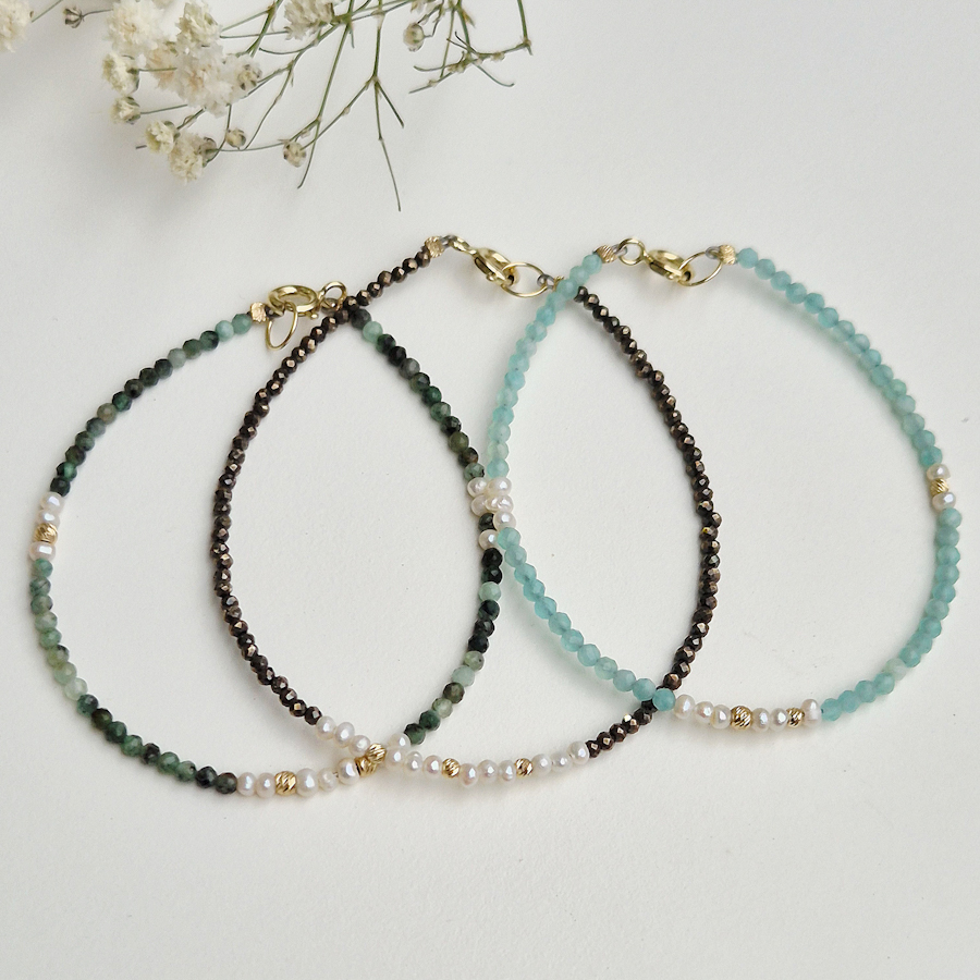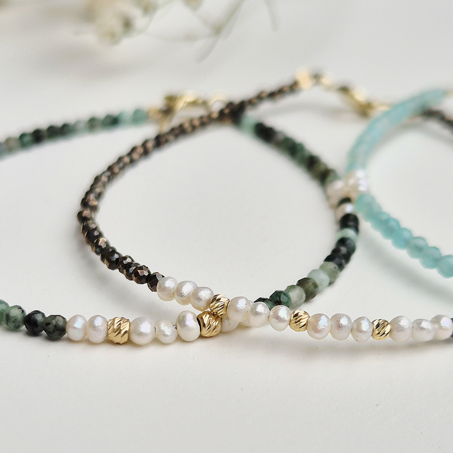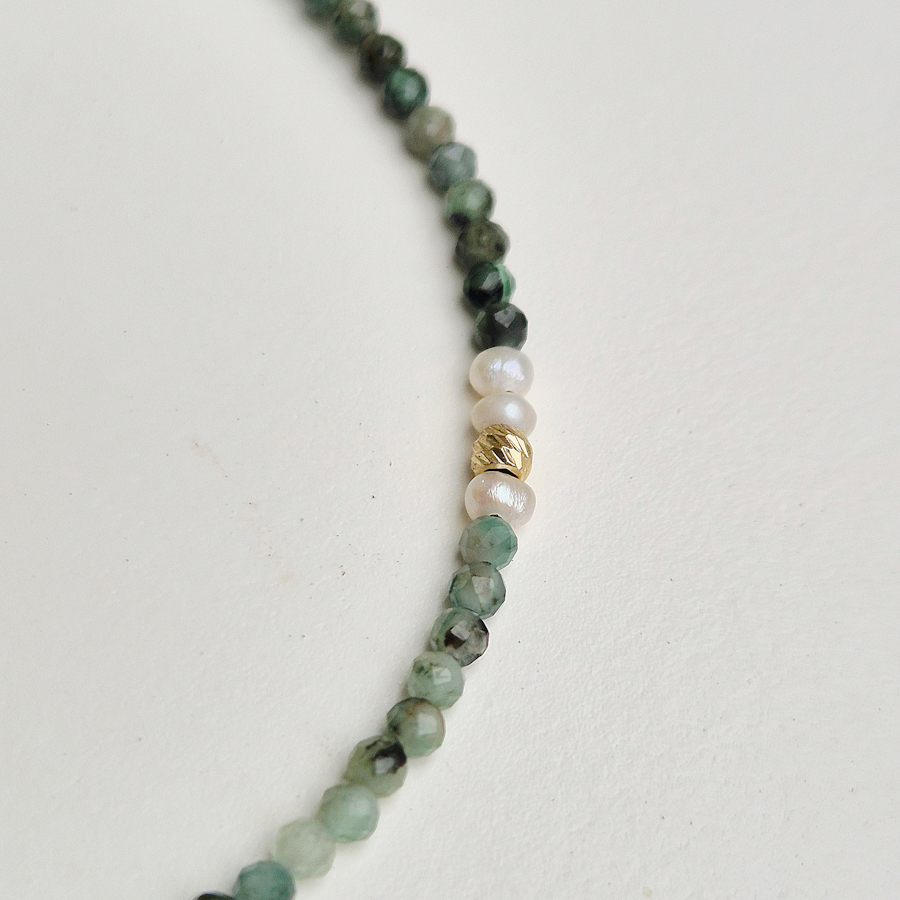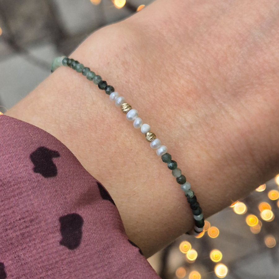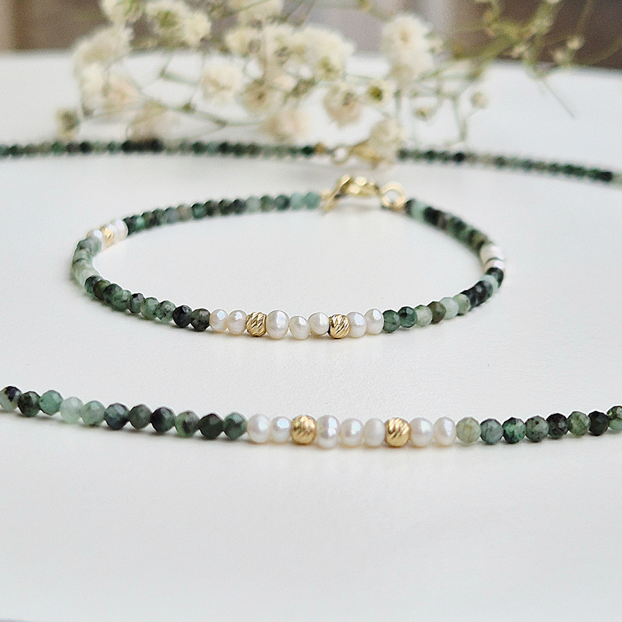 Zlatý elegntný náramok je navrhnutý v minimalistickom dizajne a spája prírodný smaragd s jemnými riečnymi perlami. Smaragd je vzácny polodrahokam, ktorý symbolizuje lásku, obnovu a vnútornú harmóniu, zatiaľ čo perly predstavujú čistotu, jemnosť a pokoj duše. Vďaka svojmu sofistikovanému vzhľadu je tento náramok ideálny na každodenné nosenie aj ako výnimočný darček s hlbokým významom.Materiál : 14 karátové zlatoPolodrahokam : riečna PERLA, SMARAGDVáha : 1,43 gDĺžka 17 cmK uvedenému šperku je vhodné skombinovať do súpravy náhrdelník. (Viď súvisiaci tovar).
