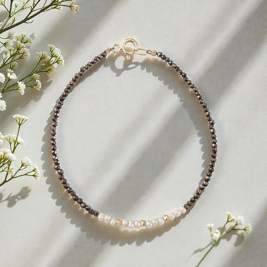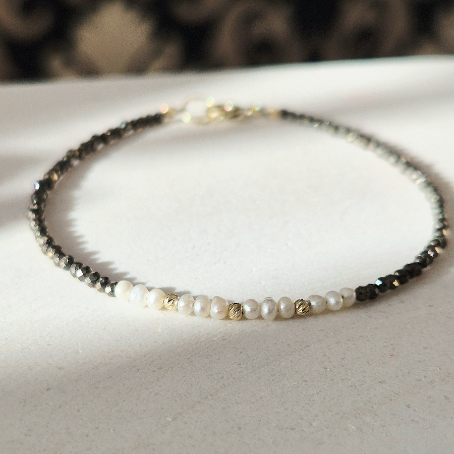 Tento výnimočný a luxusný náramok z čiernych minerálov pyritu, prírodných perál a zlatých detailov je elegantným doplnkom pre modernú ženu. Je to obľúbený šperk, ktorý vynikne samostatne aj v kombinácii s inými šperkami. Vhodný na každodenné nosenie... Zobraziť celý obsah