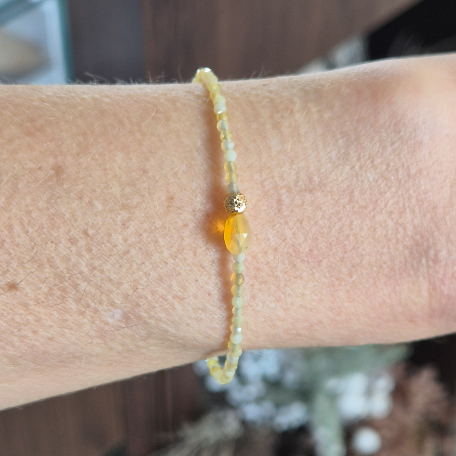 Tento citrínový náramok je navrhnutý z drobných fazetovaných korálok citrínu v jemných žltých odtieňoch s dominantným centrálnym kameňom citrínv strede, doplneným o zlatý dekoratívny prvok. Elegantný a harmonický dizajn pôsobí žensky a sviežo, vďaka... Zobraziť celý obsah