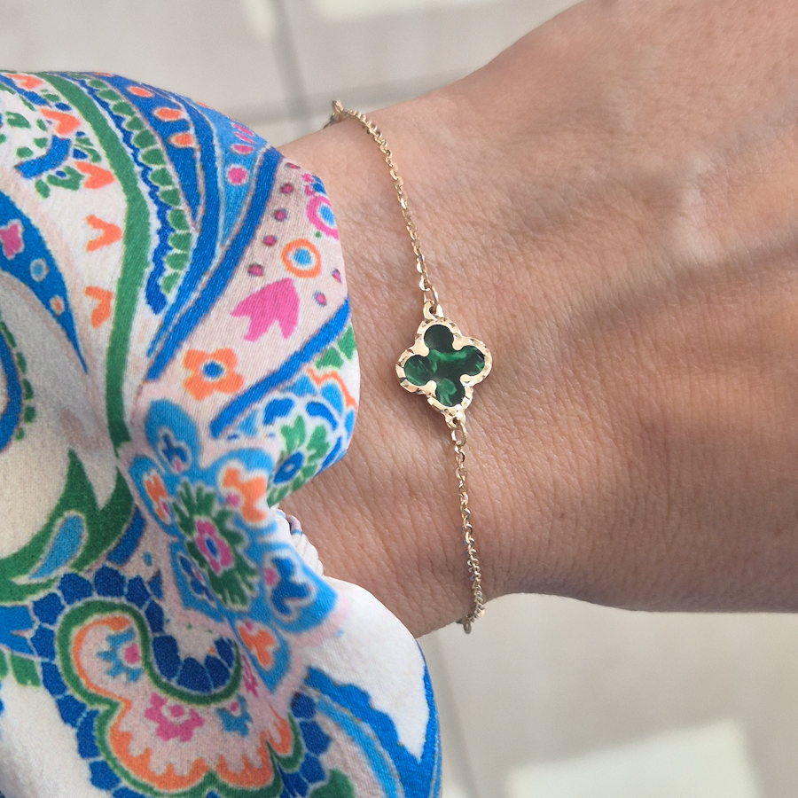 Objavte vlastnosti nádherného jadeitu a krásu prírodnej zelenej farby v našich šperkoch. Tento drahý kameň prináša do života energiu a vitalitu, podporuje zdravie i spánok. Náramok sa skladá z retiazky, ktorá spája 3 ks štvorlístkov. Väčší, dominantný je zakomponovaný v strede v retiazke a dva bočné sú rovnomerne rozmiestnené. Okraje štvorlístkov sú krásne gravírované rovnako osadené na líci i rube tak žiadaného tvaru štvorlístka. Materiál : 14 karatové zlato Váha : 1,89 g Dĺžka : 19 cm