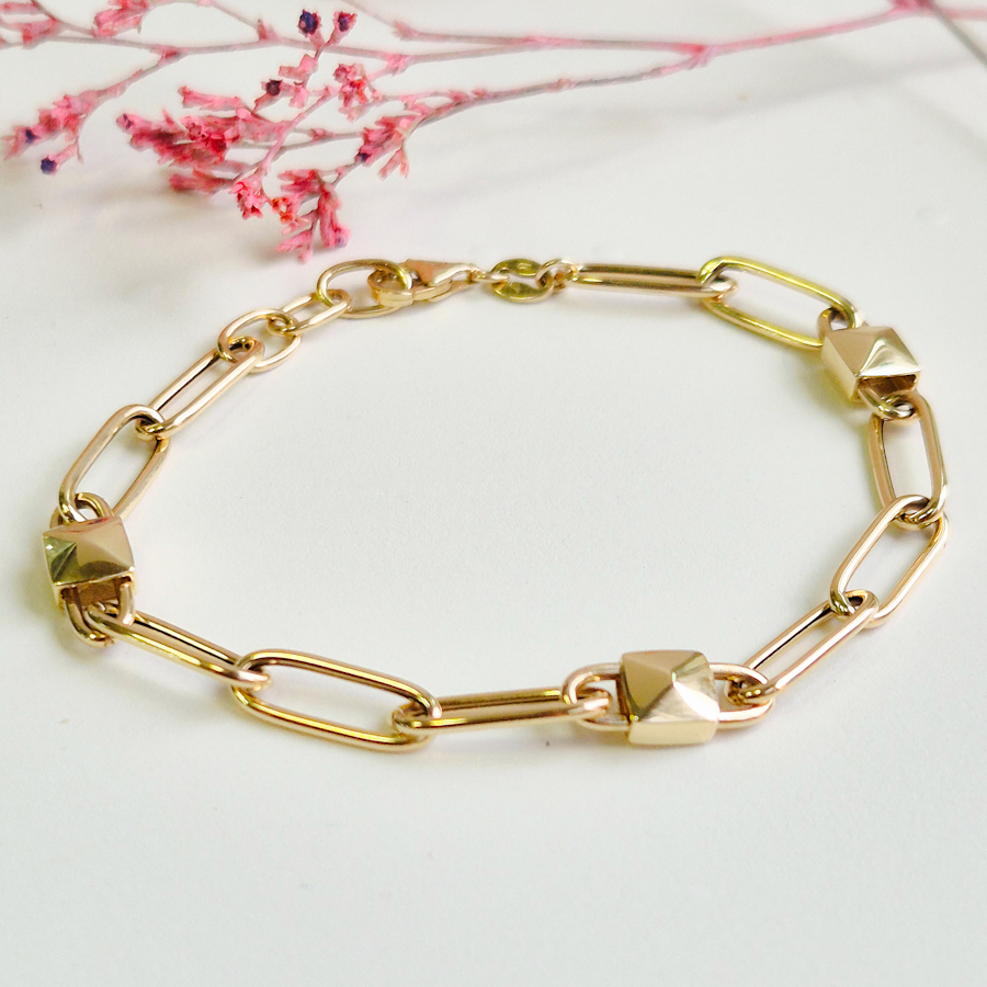 Zlatý náramok vyrobený vyniká originálnym článkovým prevedením v tvare zámkov. Moderný a zároveň nadčasový šperk, ktorý krásne doplní každý outfit a je ideálny aj ako luxusný darček pre ženu.Materiál : 14 karátové žté zlatoVáha : 4.31 gDĺžka : 17,5 – 19 cm