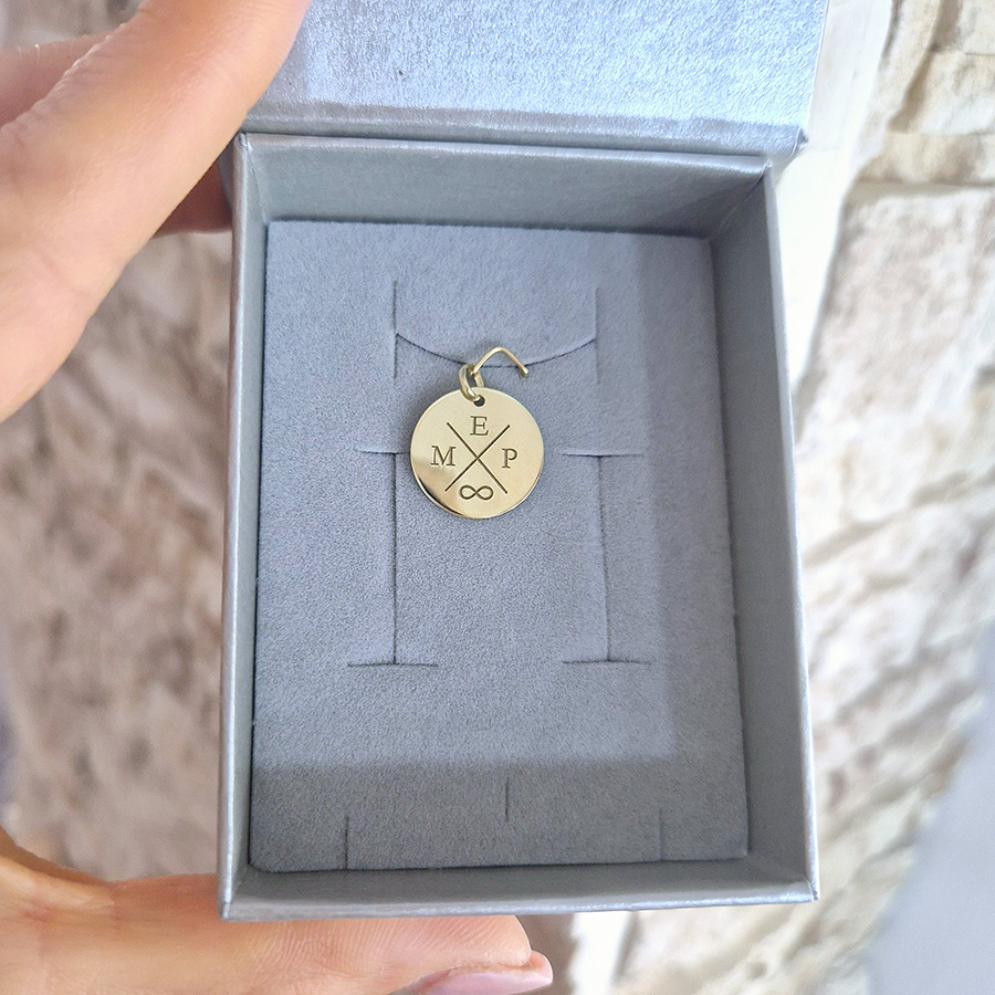 Medailón v tvare kruhu s gravírovaním iniciál rodiny a symbolomElegantný medailón v tvare kruhu z 14k zlata je viac než len šperk – je osobným amuletom, ktorý nesie iniciály vašej rodiny alebo meno blízkeho. Vďaka možnosti gravírovania symbolov ako srdce ♥, nekonečno ∞ či labka sa stáva jedinečným doplnkom s hlbokým významom. Tento šperk je dojímavým darčekom pre ženu, ktorá ocení zlaté šperky s personalizáciou, symbolikou jednoty, života, rodiny a dobra.