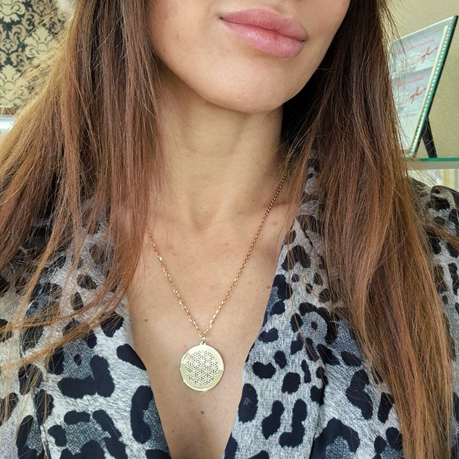 Zlatý prívesok v tvare kvetu života – jedinečný rodinný šperk s gravírovaním iniciál rodinyKvet života je starodávny geometrický vzor pozostávajúci zo série prekrývajúcich sa kruhov, ktoré vytvárajú dokonale symetrický tvar. Tento symbol má hlboké korene v rôznych starobylých kultúrach, kde bol považovaný za základný stavebný prvok života a vesmíru. Vďaka možnosti gravírovania iniciál rodiny sa stáva jedinečným šperkom s osobným príbehom. Vyrobený z 14k zlata, je ideálnym darčekom pre ženy aj mužov, ktorí ocenia rodinné šperky a jedinečné zlaté prívesky s hlbokým významom.