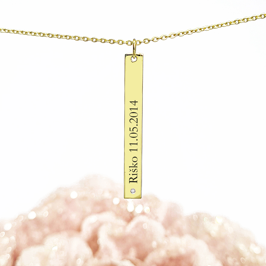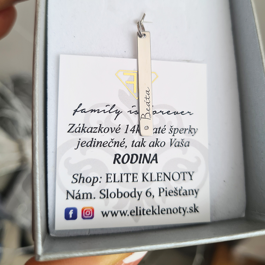 Luxusný 14k prívesok v tvare úzkeho obdĺžnika s briliantom sa stane ozdobou každého dekoltu. Zaveste si ho na zlatú retiazku a tešte sa z jeho čistých línií a moderného nadčasového dizajnu. Samozrejme, aj na tento šperk s briliantom je možné nechať vygravírovať meno, dátum, iniciály, či iný osobný odkaz.