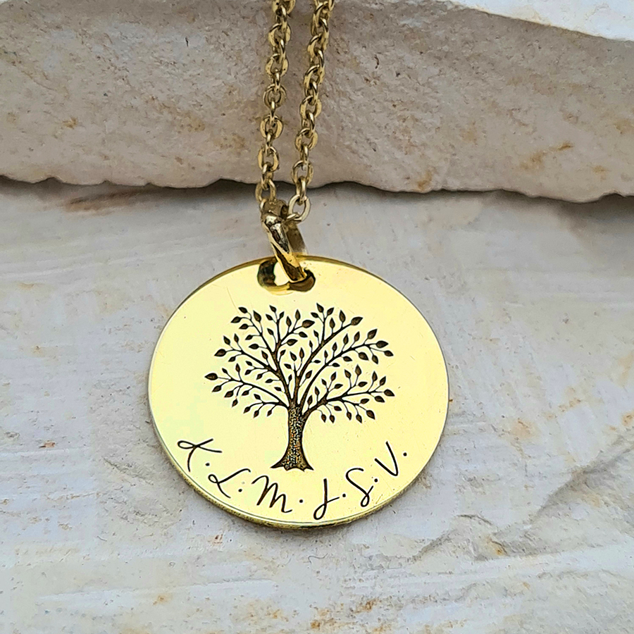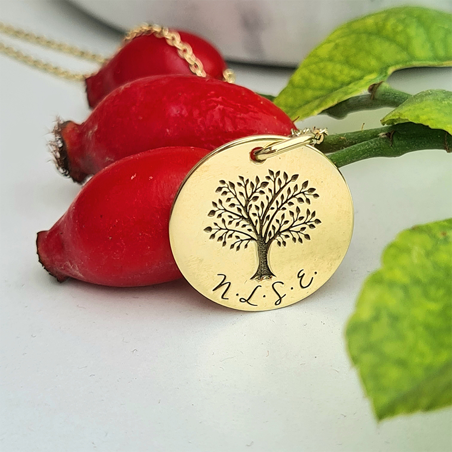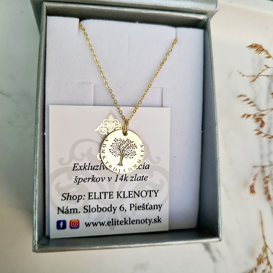 Zlatý prívesok STROM ŽIVOTA s gravírovanými INICIÁLAMI RODINY – 14k zlato