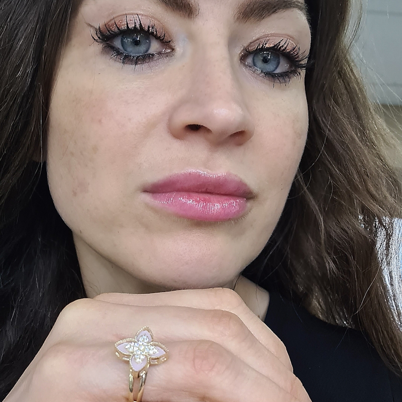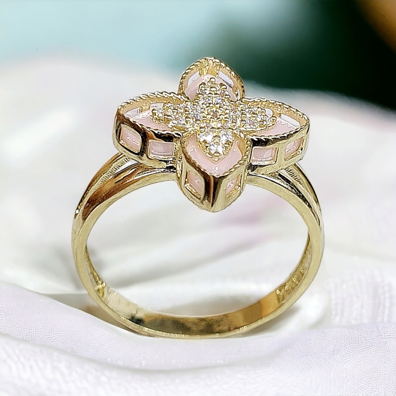 Zlatý prsteň benátsky kvet s ružovou perleťou a zirkónmi