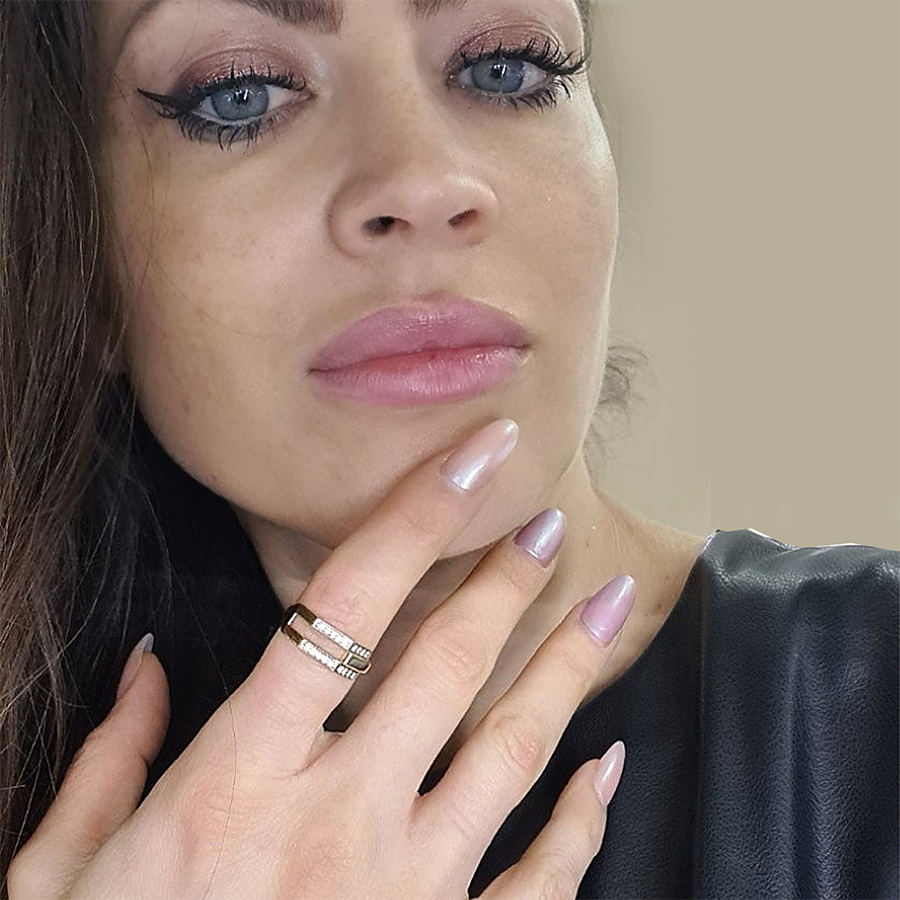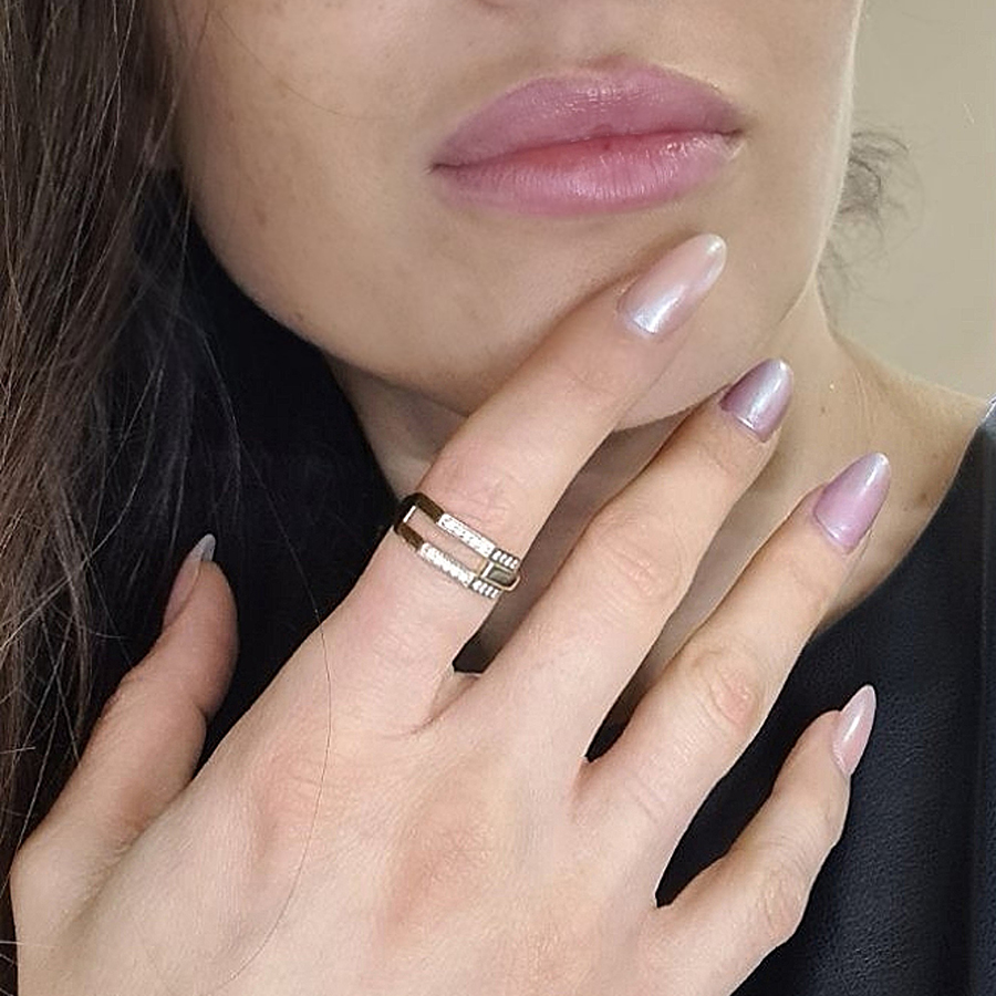 Tento prsteň zo 14 karátového zlata s dvojradovým vykladaním je štýľový a originálny, ideálny pre tie ženy, ktoré maju radi osobitý štýl. Urobte si radosť netradičným šperkom. Materiál: 14 karátové zlato (585/1000)... Zobraziť celý obsah