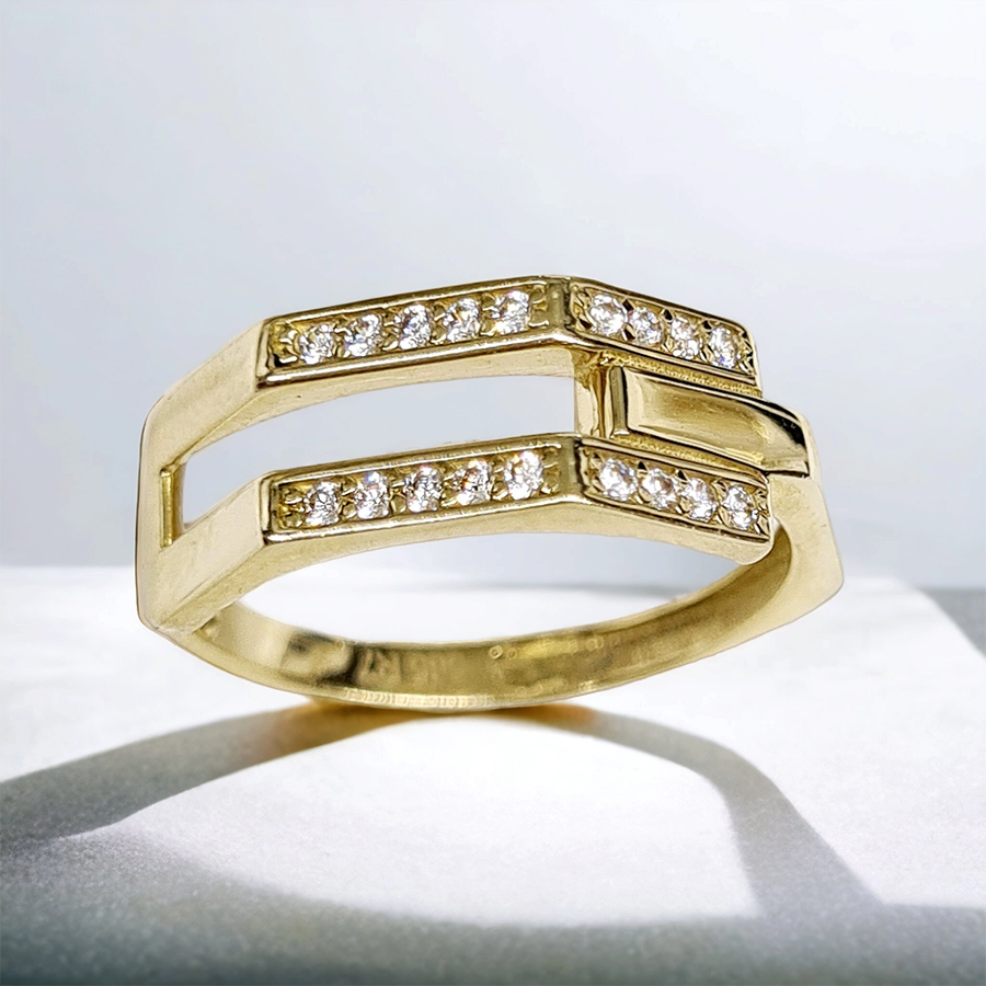 Tento prsteň zo 14 karátového zlata s dvojradovým vykladaním je štýľový a originálny, ideálny pre tie ženy, ktoré maju radi osobitý štýl. Urobte si radosť netradičným šperkom. Materiál: 14 karátové zlato (585/1000) Veľkosť: 54 Váha: 2,1g Kamienky: zirkón