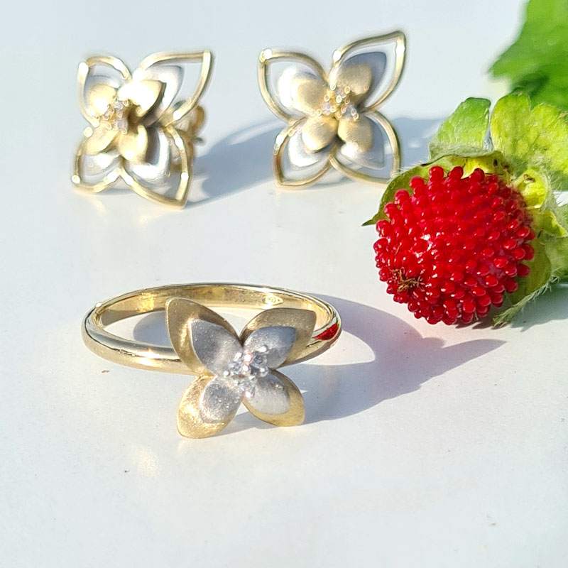 Jemný, až romantický prsteň z dvojtónového zlata v centre zdobený bielym zirkónom. Určite poteší dámu každého veku. Jeho výhodou je, že sa môže kombinovať i k šperkom z bieleho zlata. Materiál : 14 karátové zlato Váha : 2.76 g Veľkosť : 53 – 54 K uvedenému šperku je vhodné skombinovať do súpravy náušnice. Viď SÚVISIACI TOVAR