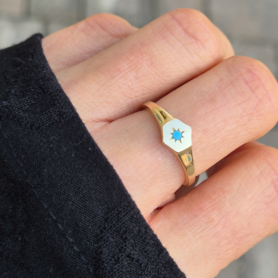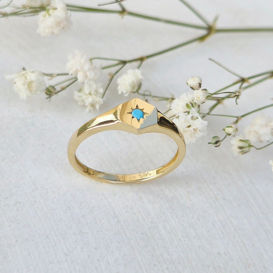 Tento elegantný prsteň zo zlata má šesťuholníkový tvar očká s jemným gravírovaným motívom hviezdy a tyrkysovým kameňom v strede, čo mu dodáva výrazný, no zároveň jemný vzhľad. Minimalistický a zároveň symbolický dizajn je ideálny na každodenné nosenie aj ako výnimočný darček s osobným významom. Obľúbený typ šperku, ktorý vynikne samostatne aj v kombinácii s inými prsteňmi.Maateriál : 14 karátové zlatoVáha : 1,32 gVeľkosť : 54