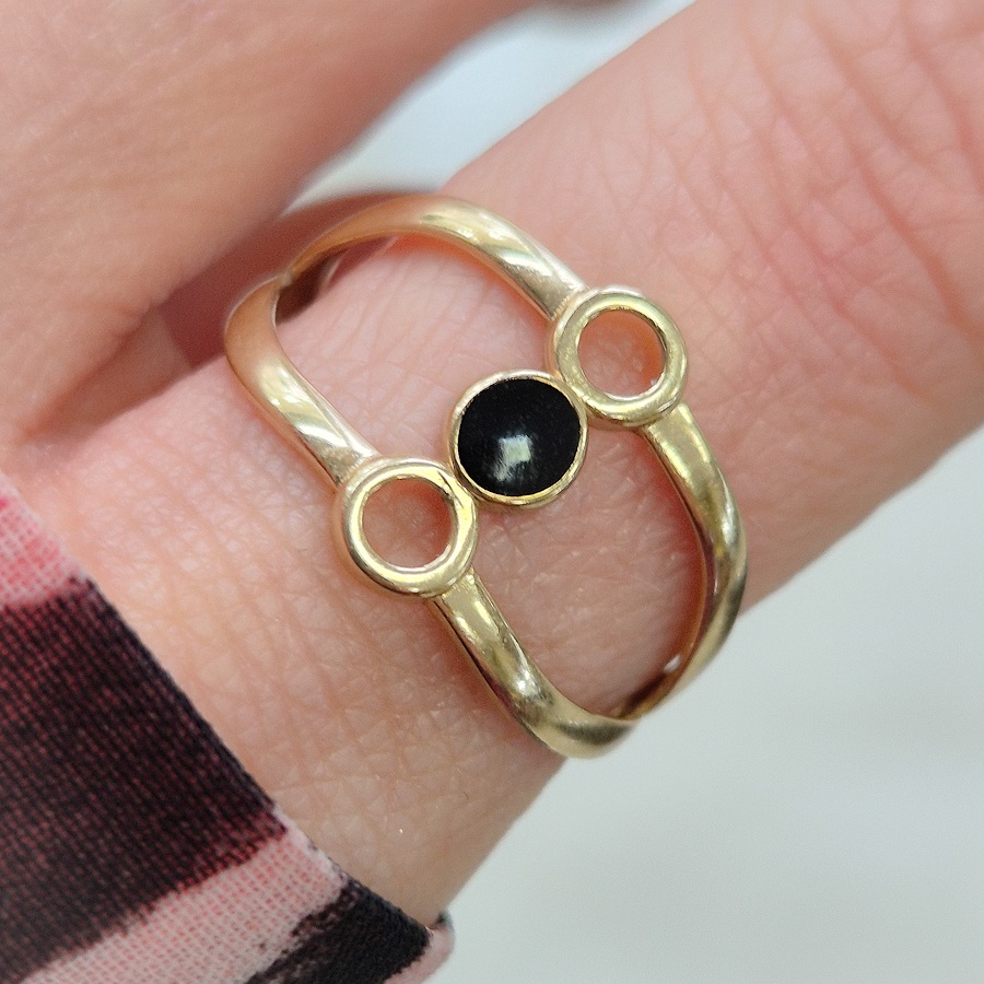 Tento prsteň má elegantný jemný dizajn. Tvorí ho roztvárajúca sa obrúčka, a v tomto priestore sú osadené nad sebou 3 oblé prvky – kolieska. Dva sú prázdne a stredný je vyplnený Onyxom, čo mu dodáva sofistikovanosť. Pôsobí veľmi štýlovo a vkusne. Materiál : 14 karátové zlato Váha : 1,57 g Veľkosť : 55