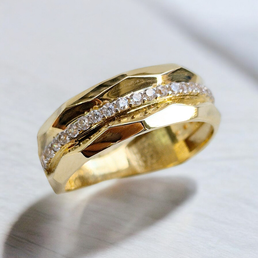 Prsteň má elegantný a moderný dizajn. Má lesklé mierne fazetované okraje. V strede prsteňa ide 1 línia vykladaných zirkónov, čo ho robí luxusným a zaujímavým. Prsteň kombinuje klasický i moderný štýl a je vhodný na každodenné nosenie. Materiál : 14 karátové zlato Váha : 2,76 g Veľkosť : 55