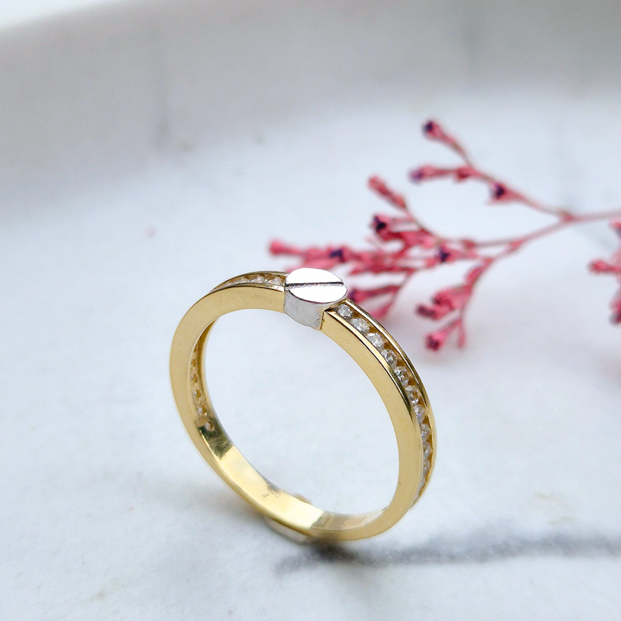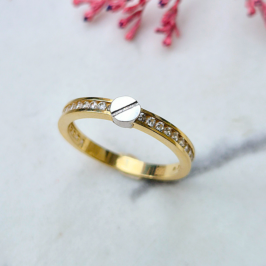 Prsteň je jemný, elegantný, zlatá obruč je zdobená zirkónmi po oboch stranách, ktoré dodávajú ligotavý efekt. Dominantou je v prednej časti umelecký až industrialny prvok, malý lesklý šroubik z bieleho zlata, ktorý robí prsteň originálnym a netradičným. Spája eleganciu a industriálnosť v jeden pekne pôsobiaci celok.Materiál : 14 karátové zlatoVáha :2,09 gVeľkosť : 55