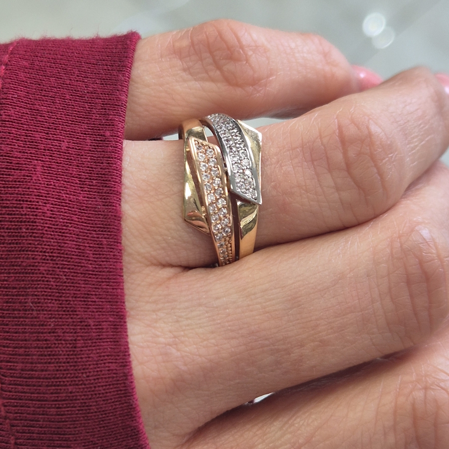 Luxusný trojtónový prsteň je zaujímavý v centrálnej časti. Z jednej i z druhej strany obrúčky sa centrálne stretajú dve línie, biela a ružová, bohato vykladaná zirkónmi. V spodnej i hornej časti sú 2 pozdĺžne trojuholníky žltého zlata, ktoré akoby uzatvárajú celkový dizajn. Je to elegantný a očarujúci prsteň. Materiál : 14 karátové trojtónové zlato Váha :2,85 g Veľkosť : 58